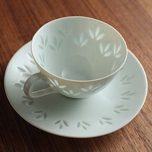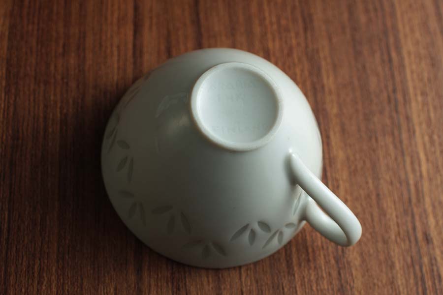オーストリア出身のデザイナー、Friedl Holzer Kjellberg/フレイドル・チェルベリーが10年の試行錯誤の末に生み出した銘品です。素焼きした生地に透かし彫りを施した後、さらに釉薬をかけてもう一度焼成することで、透き通ったとても美しい模様が浮かび上がります。カップ、ソーサーの底面にも同様の手法で刻印が施されています。