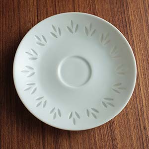 オーストリア出身のデザイナー、Friedl Holzer Kjellberg/フレイドル・チェルベリーが10年の試行錯誤の末に生み出した銘品です。素焼きした生地に透かし彫りを施した後、さらに釉薬をかけてもう一度焼成することで、透き通ったとても美しい模様が浮かび上がります。カップ、ソーサーの底面にも同様の手法で刻印が施されています。